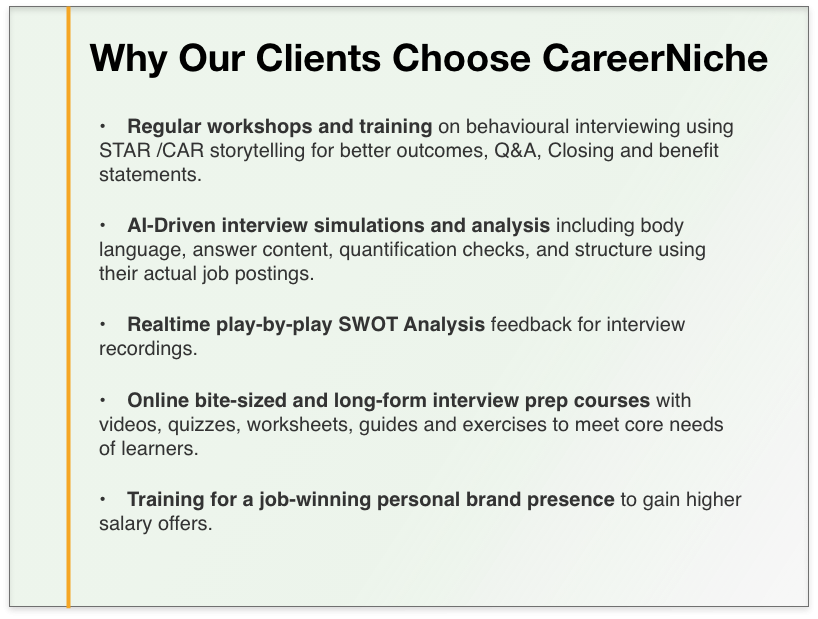 Comprehensive interview training and AI-Powered Analysis with Simulations to optimize performance in multifaceted ways. This improves Behavioural interviewing success.