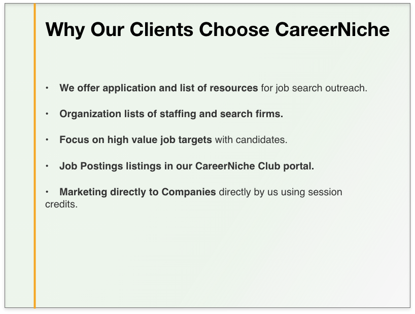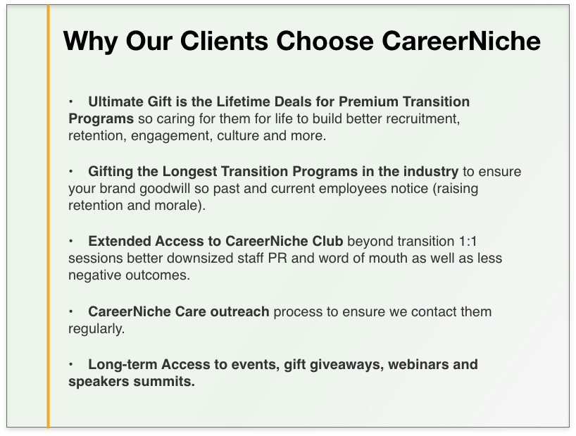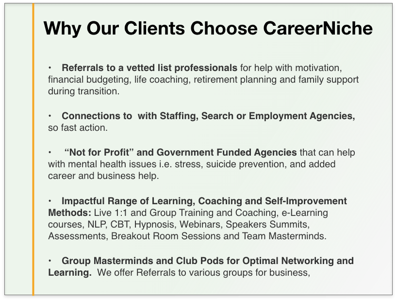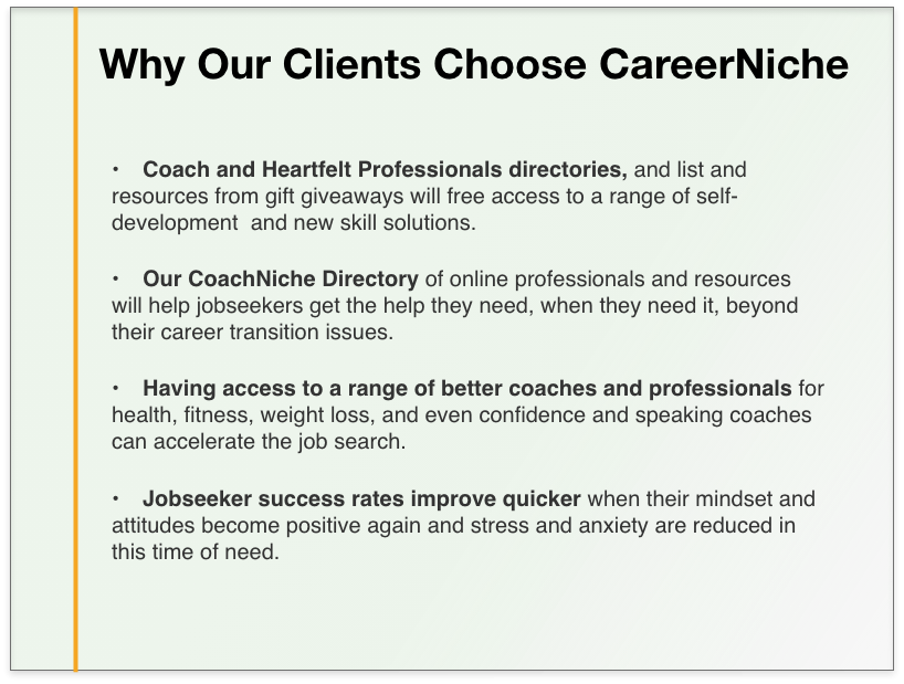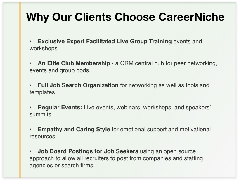 An exclusive membership community portal with a club belonging feel. It helps jobseekers network with other job seekers and coaches. It is the central hub for all other services including live event, newsletters and more. They are informed, engaged and supported.