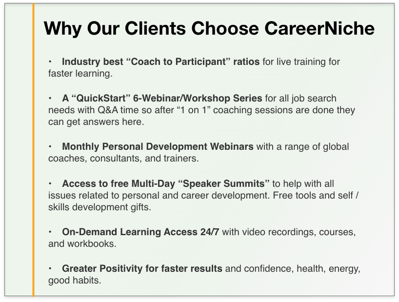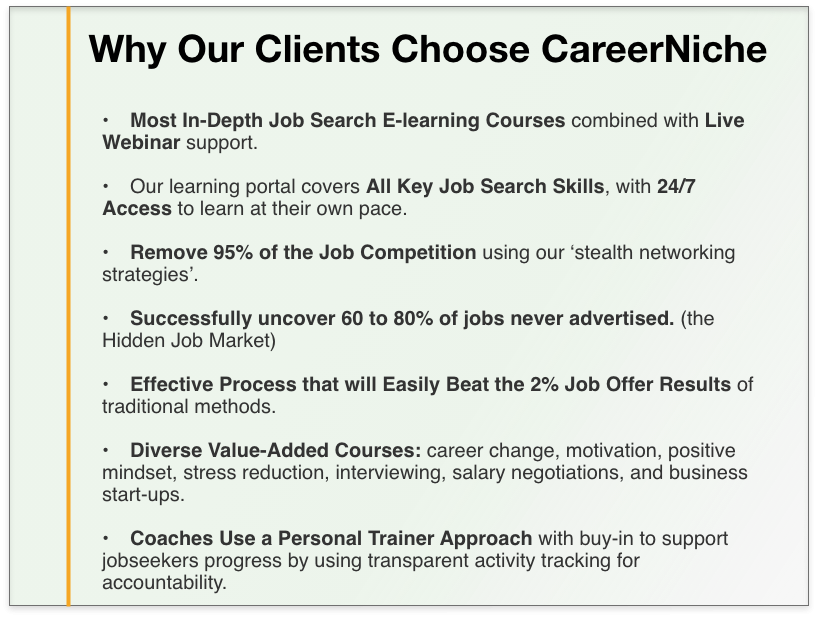 On-demand 24/7 Access to an Easy-to-Use Learning Management System (LMS) that provides job search and career transition specific courses with interactivity, simplified steps, videos, quizzes, motivation and expert insights for more greater job search success.