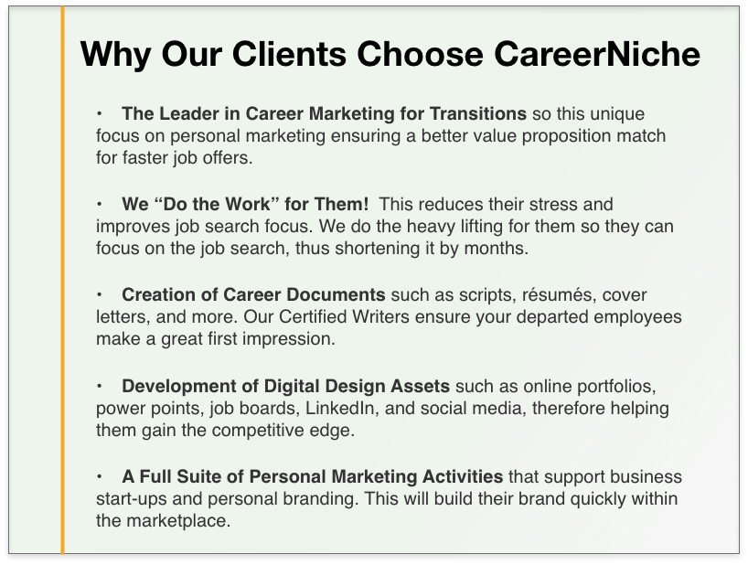 Professionally crafted resumes, cover letters and LinkedIn profiles designed to accelerate your employees’ job search and position them for success.