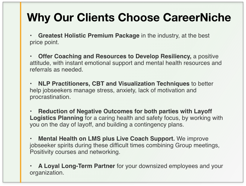 Personalized coaching that helps transitioning employees define goals, rebuild confidence and move forward into new opportunities—showing your organization’s commitment to their success.