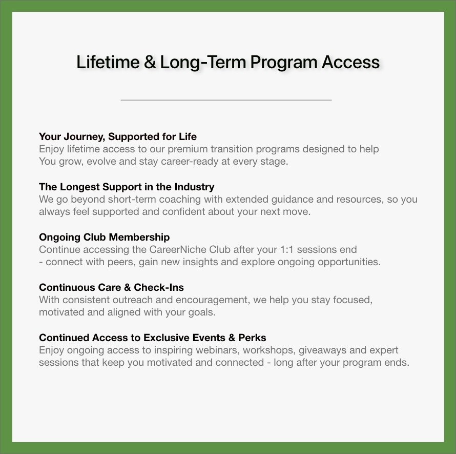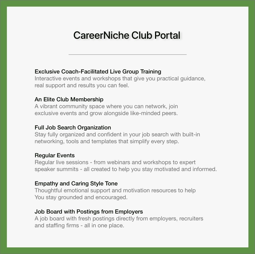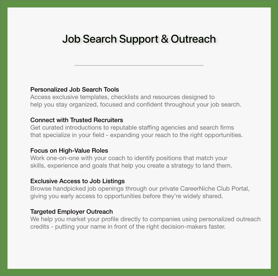 Your career journey isn’t one-size-fits-all. We guide you step-by-step—from uncovering your strengths to securing the role you’ve been working toward. Together, we help you build a stronger résumé and cover letter, clarify your personal brand, and create a focused job search plan. You’ll gain a clear career roadmap, a holistic marketing strategy, and ongoing support through your CareerNiche Club membership.