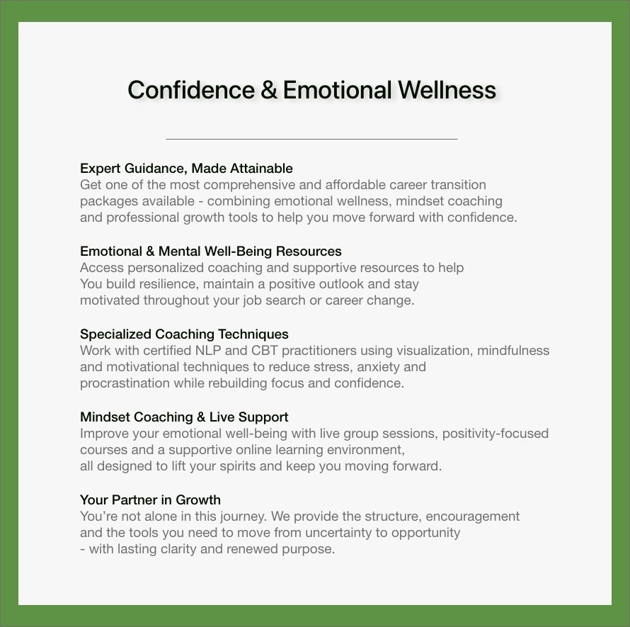 We empower individuals at every stage of their career journey — from those just starting out and feeling unsure, to active job seekers navigating their next opportunity, to professionals ready to pivot and redefine their path. Whether you’re struggling to get started, searching for the right fit or building a completely new direction, we guide you with clarity, confidence and support every step of the way.